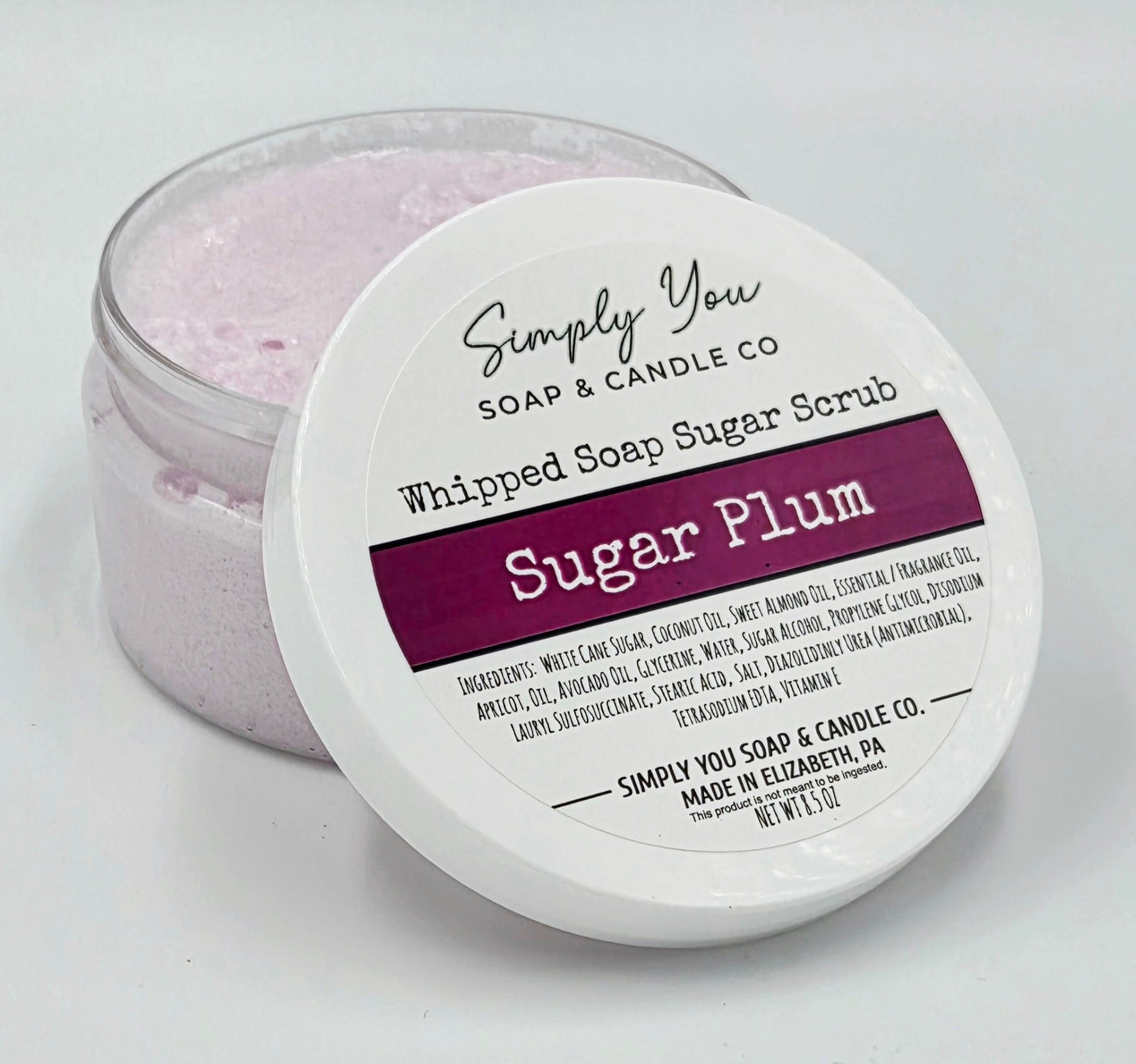 Ingredients: white cane sugar, coconut oil, sweet almond oil, essential/fragrance oil, apricot oil, avocado oil, glycerine, water, sugar alcohol, propylene glycol, disodium lauryl sulfosuccinate, stearic acid, salt, diazolidinly urea (antimicrobial), tetrasodium EDTA, vitamin E.